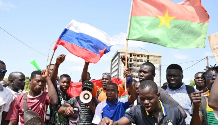 Brandissant des drapeaux russe et burkinabè, les manifestants, majoritairement des commerçants et travailleurs du secteur privé, ont scandé des slogans anti-impérialistes et protesté « contre l’ingérence dans les affaires internes du Burkina » devant l’ambassade, protégée par un cordon sécuritaire de la police anti-émeute.