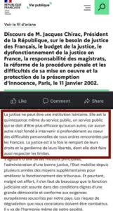 Le 11 janvier 2002, à Paris (France), le président Jacques Chirac, dans son discours sur le besoin de la justice, des Français, le budget de a justice, le dysfonctionnement de la justice en France, la responsabilité des magistrats, la réforme de la procédure pénale et les difficultés de sa mise en œuvre et la protection de la présomption d’innocence, avait notamment dit :