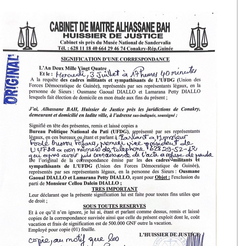 En refusant de prendre la signification qui a été adressée au Bureau politique National de l’Union des forces démocratiques de Guinée, comme indiqué dans le rapport de l’Huissier, le vice-président Fodé Oussou Fofana a involontairement commis une erreur, car la réception du document portant exclusion du président El-Hadj Cellou Dalein Diallo ne validait en rien la décision.