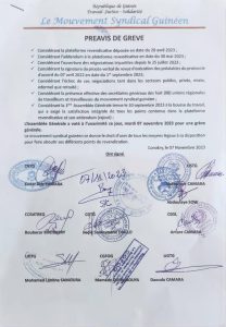 Comme annoncé précédemment, le mouvement syndical guinéen a décidé de déposer un préavis de grève ce mardi, 07 novembre 2023, après l’échec des négociations menées jusque-là avec le gouvernement autour de l’augmentation des salaires des travailleurs et des pensions de retraite. La décision a été prise au cours d’une assemblée générale tenue ce matin à la bourse du travail, à Conakry.
